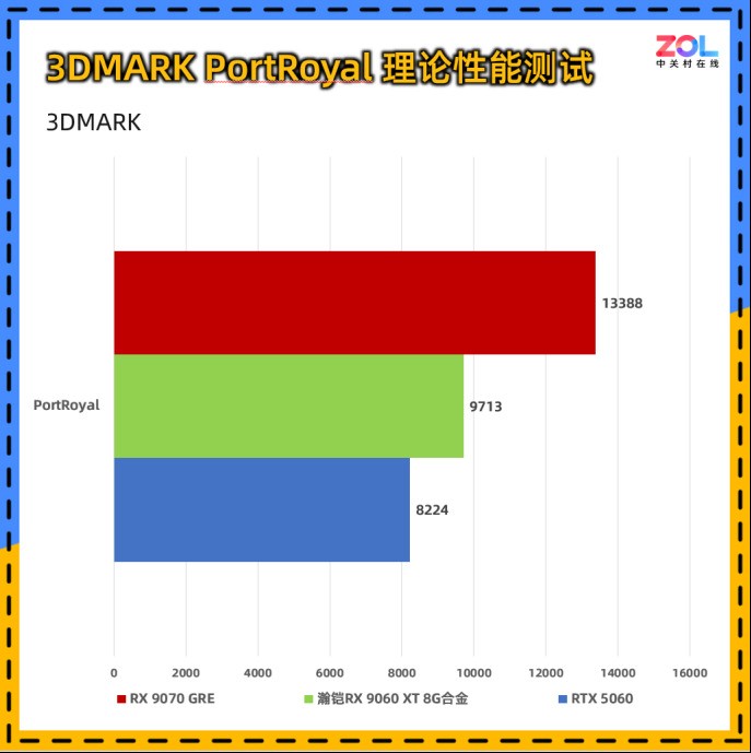 PortRoyal是3DMARK中专门针对光追性能的测试项,光线追踪本是AMD的弱势项,不过在使用RDNA 4架构的RX 9000系显卡中,光追性能有了极大的提升。从实测数据来看,瀚铠RX 9060 XT 8G合金相较RTX 5060的提升为18%左右;与RX 9070 GRE的差距约为27%。
