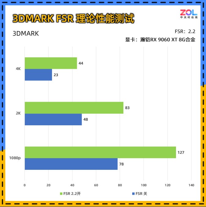 在3DMARK的FSR测试中,比较接近于实际的游戏帧数表现,同时也比较直观的反映出两款显卡的差距。瀚铠RX 9060 XT 8G合金有不错的表现,在1080P分辨率下开启FSR可以拿下127的帧数。