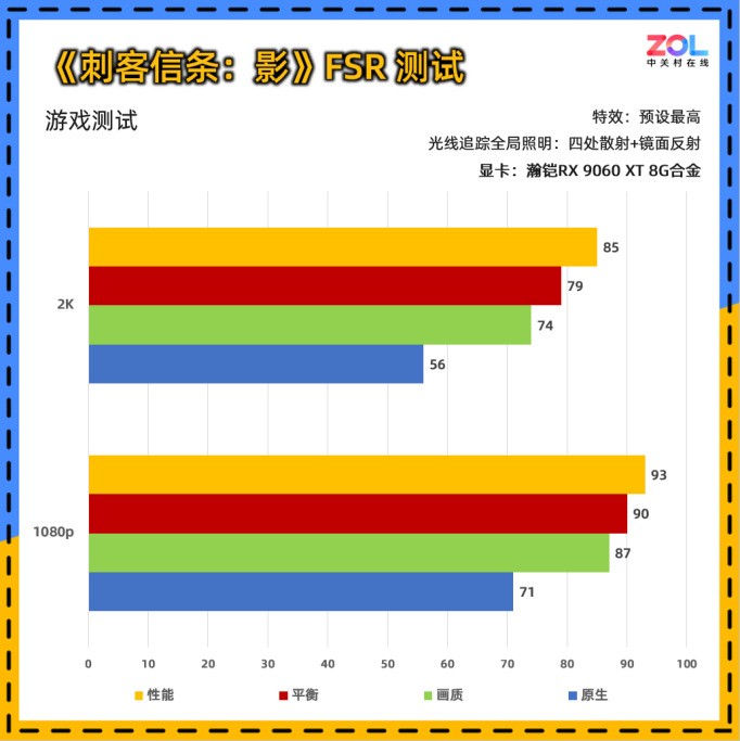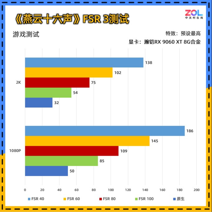 近来大火的《燕云十六声》测试画质默认最高,但在该游戏中FSR并没有明确档位。所以测试不同缩放下的帧数情况。《燕云十六声》支持FSR 3帧生成功能,实际测试来看,帧率提升非常明显,瀚铠RX 9060 XT 8G合金在2K分辨率FSR 60下,可达到百帧水准,1080P则拿下145帧的成绩。
