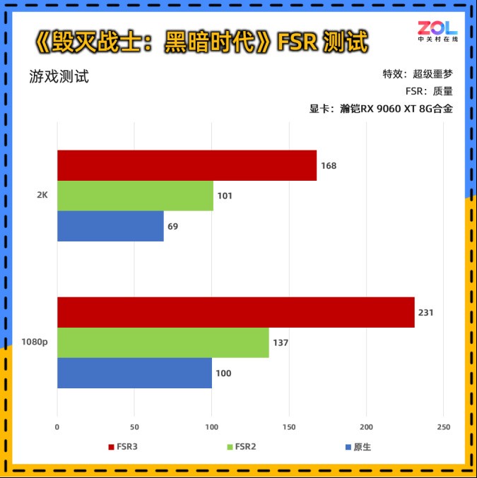 《毁灭战士:黑暗时代》自带FSR 3帧生成,并且对于提帧技术的兼容性极佳,这里我们对比原生画质与不同FSR之间的差距。瀚铠RX 9060 XT 8G合金在2K分辨率下开启FSR 3将帧数从69帧之间提升至168帧,1080P的分辨率下更是拿到了231帧的丝滑表现。