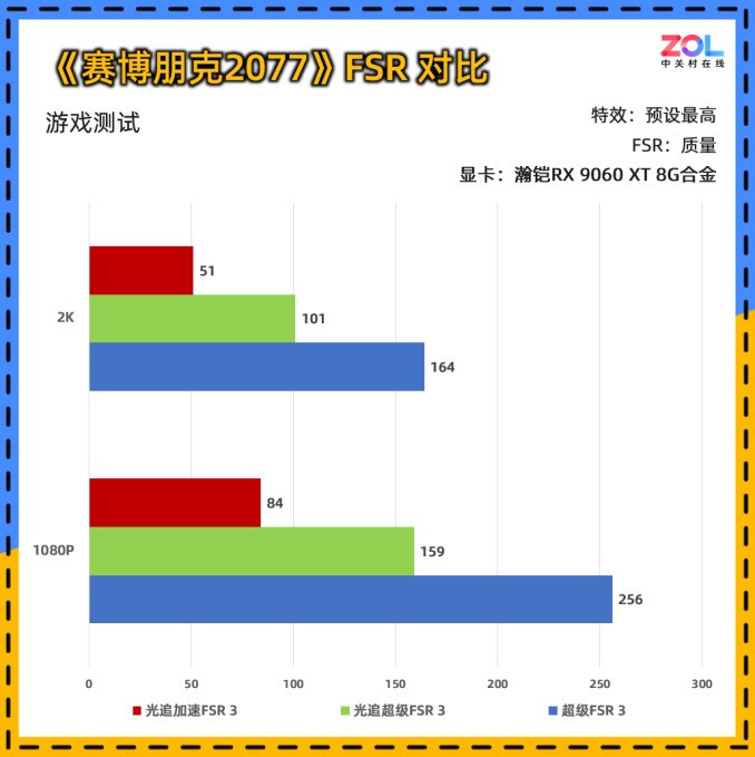 在《赛博朋克2077》中,测试分为超级画质与光追超级画质,固定FSR质量挡位。可以看到在开启FSR 3帧生成后,帧数有着质的飞跃,几乎达到FSR 2的2倍。可以看到,瀚铠RX 9060 XT 8G合金在2K分辨率光追超级画质中,依然有101帧的成绩。作为一张入门级甜品卡,RDNA 4架构在光追上的进步无疑是巨大的。