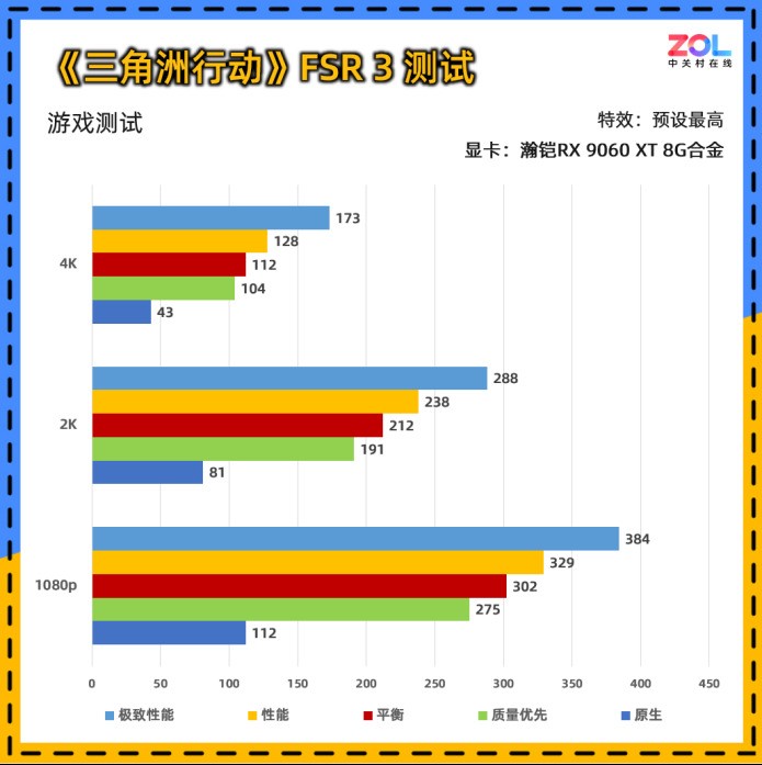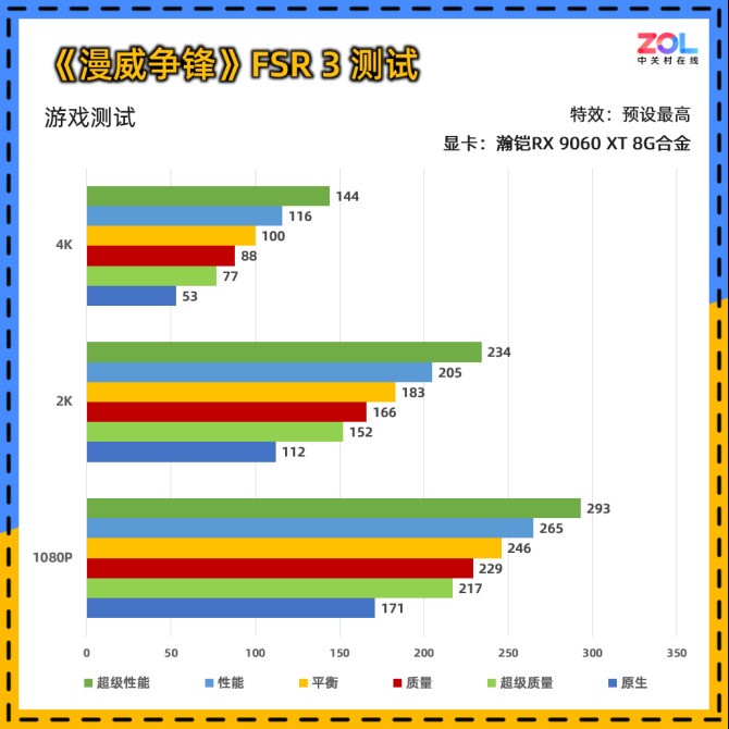 《漫威争锋》这款网游也集成了FSR 3,在测试中,所有画质默认为最高,仅调节FSR档位来观察帧数变化。从实际测试来看,瀚铠RX 9060 XT 8G合金在4K分辨率平衡模式下帧数仍然可以达到100,当然这款显卡并不是为4K游戏设计的,而2K分辨率下的183帧率要好看得多。