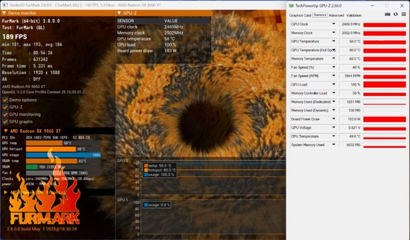 瀚铠RX 9060 XT 8G合金在20分钟左右的满载拷机中,温度稳定为58℃;热点温度80℃;显存温度82℃;风扇转速46%,功耗为183W左右,整体的噪音很低,而且对电源的压力并不大,再加上这款显卡使用了单8 pin供电接口,意味着玩家无需升级电源。