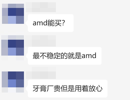 不过即使现在AMD在DIY圈子里如此活跃,笔者发现依旧有很多用户对于AMD存在刻板印象,甚至在群里看到群友们聊到AMD时还出现下图对话。不得不说即使2024年了,即使9800X3D都供不应求了,多人对AMD的印象依然是性能不强、不稳定,觉得AMD平台除了价格外其他都不行。然而刻板印象终究只是刻板印象,市场会给出最真实的用户反馈,AMD现在锐龙9000系列不管是口碑还是稳定性上都是占优的一方,当然这一点还离不开友商的一点点“助攻”。