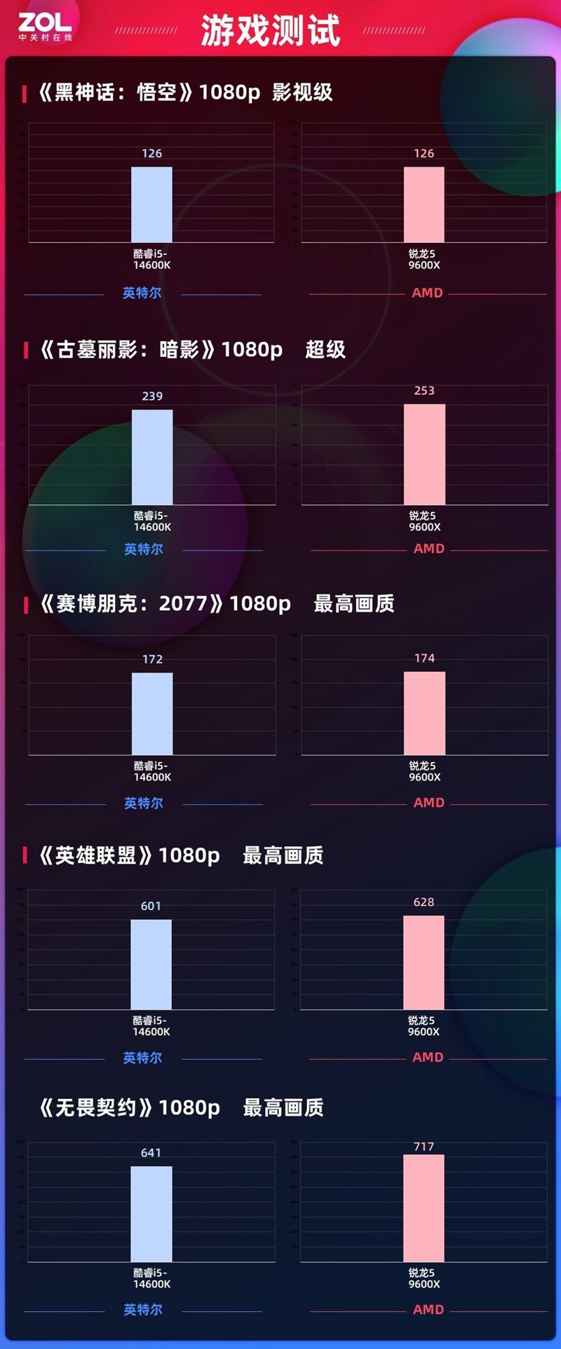 首先来看一下游戏性能的表现,为了充分体现CPU之间的性能差异,我们这次主要展示双方1080p分辨率下的帧数差异,这样会将显卡影响降到最低,同时1080p也是AMD 锐龙5 9600X和英特尔酷睿i5-14600K装机用户大部分会使用的显示器分辨率。游戏选取3款3A游戏《黑神话:悟空》、《古墓丽影:暗影》以及《赛博朋克:2077》,还有2款网游《英雄联盟》、《无畏契约》,画质预设最高。