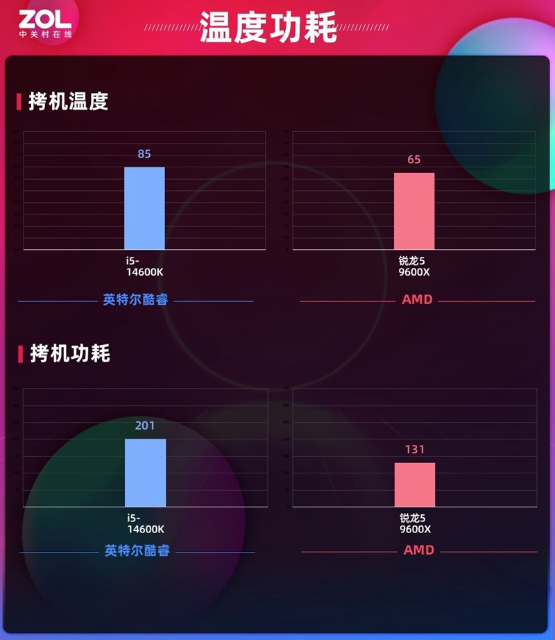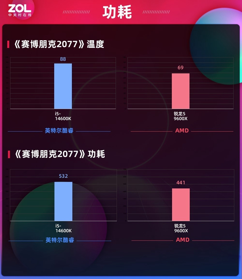 双方平台在功耗和温度差异表现上十分明显,不管是拷机还是游戏实际上,AMD 锐龙5 9600X都比英特尔酷睿i5-14600K低20度,功耗也要低上近百瓦。明显看出来AMD 锐龙5 9600X十分符合工艺和架构升级进步后应有的功耗温度降低以及性能提升表现。