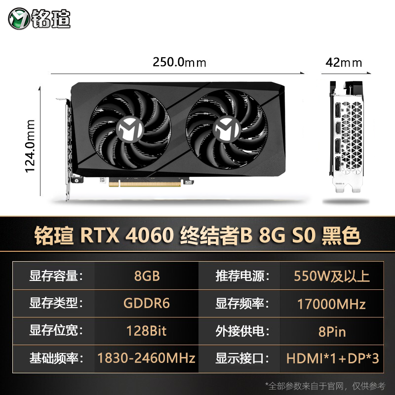 铭瑄 RTX4060瑷珈8G OC电竞游戏DLSS3台式电脑显卡 RTX4060 终结者黑色 8G
