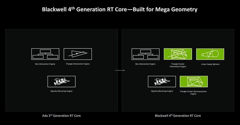 除了上面提到的Opacity Micromap Engine,在Blackwell架构中,还引入了Mega Geometry(大型几何)的运算概念。其中包含了TriangleClusterIntersection Engine、Linear Swept Spheres等新硬件。