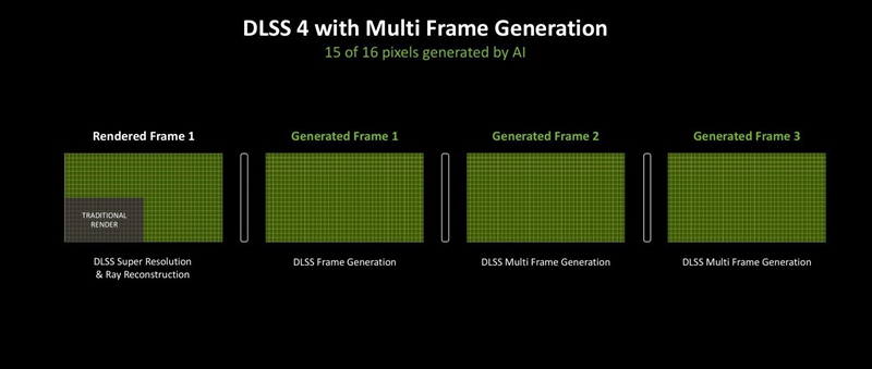 这些新技术由RTX 50系GPU和第5代Tensor Cores支持,并由云端的NVIDIA Al超级计算机提供支持。不过对于手持RTX 40系或更早期显卡的玩家还无缘体会。DLSS 4新增的多帧生成,目前仅支持RTX 50系显卡。