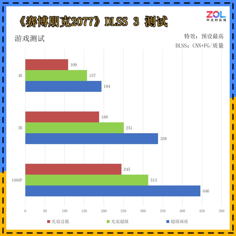 DLSS 3的测试依然为CNN模型,不过增加了帧生成技术。可以看到DLSS 3已经可以大幅提升帧数,相较DLSS 2,在4K超级画质/光追超级/光追加速的提升分别为45%/60%/73%,已经是非常惊人的成绩了。