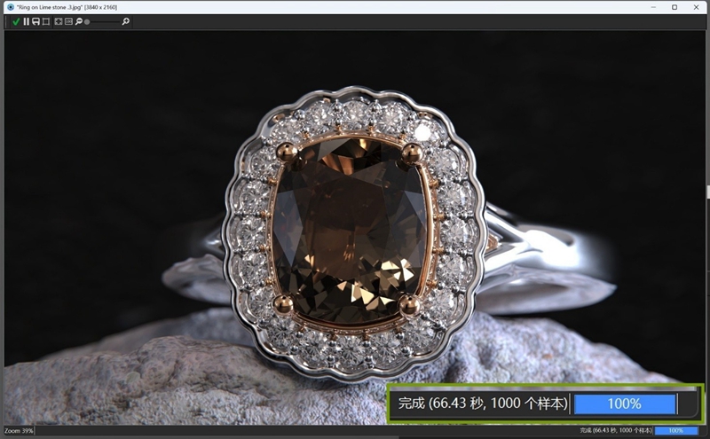 使用映众 RTX5090 D 曜夜 X3 32GB显卡渲染一张4K分辨率,采样率为1000的图片,最终用时66秒左右。