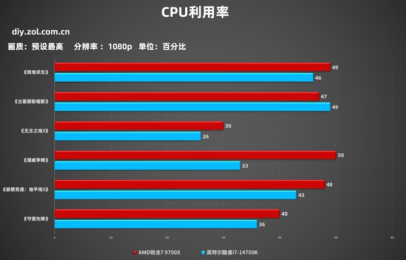 而之所以AMD锐龙79700X能够在和英特尔酷睿i7-14700K游戏性价比对决中胜出,除了AMD先进的工艺制程和ZEN5架构影响帧数外,目前游戏对于CPU的优化也是关键,我们也在游戏中监控了CPU利用率,大家看一下就懂了。