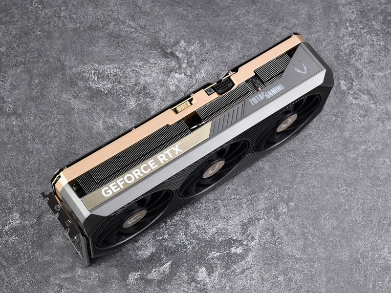 顶部是散热模组的出风口,整流罩左侧是金底白字的GEFORCE RTX字样,右侧是ZOTAC GAMING ARGB灯光模组,提供充满活力的1600万色彩及多种动态光效,即刻点亮心中热爱。除此之外,还能看到彩金色高强度合金压铸成型的中框,具有超强的抗扭、抗压能力,防止显卡变形,提升显卡整体结构强度。