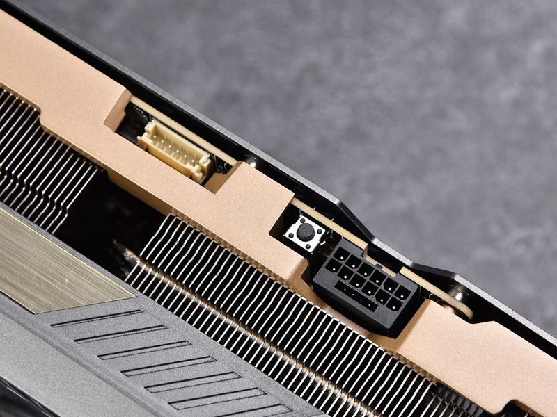供电采用单个16pin的12V-2X6新协议接口,可实现更加稳固可靠的连接。内部的PCB拥有高达22+7相供电,采用全贴片式的固态电感,大量的POSCAP对供电进行后端滤波,达到更纯净的GPU和显存供电效果。供电接口旁边的双BIOS切换开关,按下就能在静音/强效两种散热模式之间切换,左侧的6pin幻光同步接口,可将显卡连接到主板ARGB输出端口,实现整机灯光同步。
