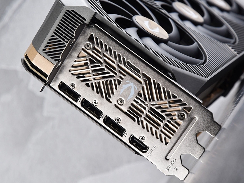 接口部分,配备了3个DP 2.1b和1个HDMI 2.1a,其中DP2.1b接口为UHBR20规格,可达80Gbps带宽,最高支持8K(7680x4320)165Hz或者4K(3840x2160)480Hz画面输出,满足多屏拼接的需求,大面积镂空的挡板更便于散热。