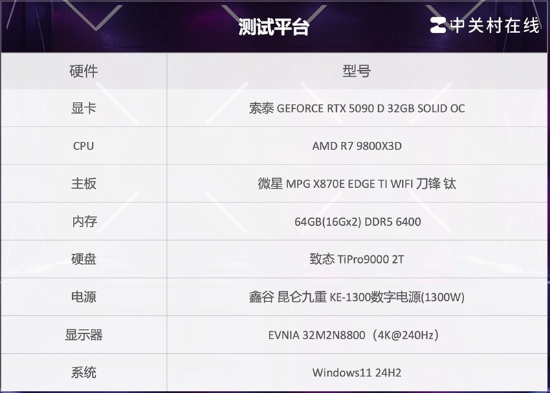 本次测试平台采用了AMD的9800X3D处理器和X870E主板的搭配,也是当下游戏性能最强的方案,并配备了64GB的DDR5-6400内存、2TB的PCIe5.0固态硬盘、1300W电源以及32寸的4K240电竞显示器,操作系统版本为Windows1124H2。