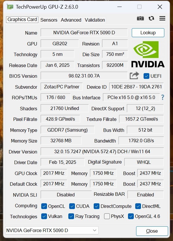 GPU-Z信息显示,这款显卡核心为GB202,采用5nm工艺制程,核心面积750mm²,拥有21760个CUDA核心,搭配32GB的三星GDDR7颗粒,位宽高达512bit,带宽17920GB/s显存频率为1875MHz。作为OC版本,这款显卡核心Boost频率为2437MHz,比公版规格高一些。