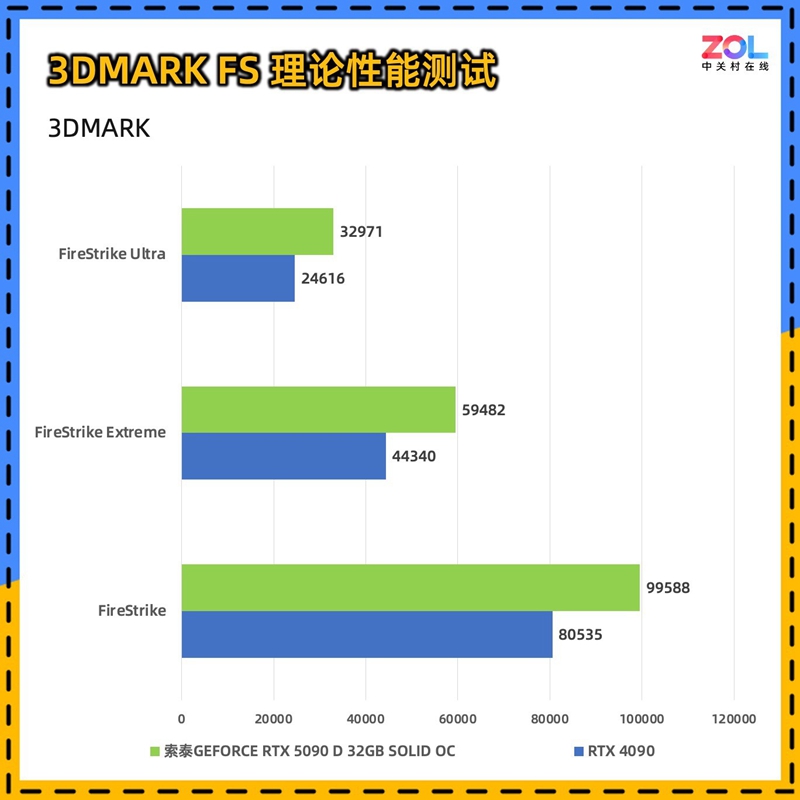 在针对DX12环境下的TimeSpy和TimeSpy Extreme测试中,索泰GEFORCE RTX 5090 D 32GB SOLID OC相较于RTX 4090,TS提升33%,TSE提升32%,综合提升约为33%。