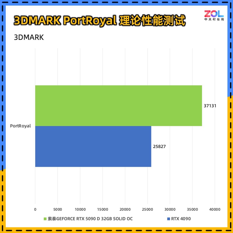 PortRoyal是3DMARK中专门针对光追性能的测试项,索泰GEFORCE RTX 5090 D 32GB SOLID OC相较RTX 4090的提升约为46%。综合来看,索泰GEFORCE RTX 5090 D 32GB SOLID OC的理论性能相较RTX4090的提升约为37%。