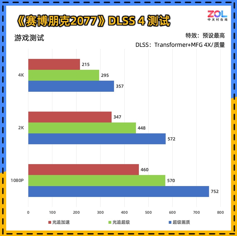 在最高DLSS4的4X帧生成模式测试,帧率再次提升到新高度,在4K超级画质、光追超级、光追加速中,相较DLSS4的3X帧生成的提升分别为27%、26%和29%,对比DLSS3帧生成则分别提升了83%、88%和90%,即便在光追加速画质也达到了215帧的高能电竞帧率,4K超级画质更是达到了惊人的357帧。