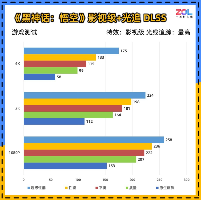 出人意料的是,《黑神话:悟空》开启全景光追后,部分分辨率帧数反而更高。索泰GEFORCE RTX 5090 D 32GB SOLID OC实测结果显示,4K分辨率下开关光追在超级性能模式中帧数差别不大,不同DLSS档位的画质也几乎没有差距。如果想获得比较高的画质,可以选择性能模式,在享受高帧率的同时,又不损失画质。