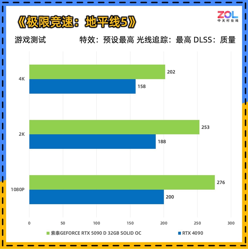 第二款游戏《极限竞速:地平线5》也是显卡测试的常客,其出色的优化在原生效果下即可跑出优秀的成绩。在4K分辨率下,索泰GEFORCE RTX 5090 D 32GB SOLID OC的DLSS3成绩再创新高,达到了259帧,让玩家真正感受风驰电掣的感觉。