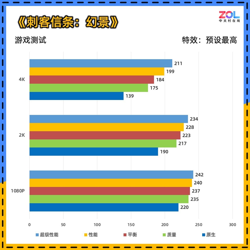 第三款游戏是《刺客信条:幻景》,我们关闭游戏的自适应帧率,分别测试DLSS不同档位与原生画质下的差异。结果显示,索泰GEFORCE RTX 5090 D 32GB SOLID OC在4K分辨率原生画质下就达到了139帧,而在DLSS超级性能档位更是达到211帧。