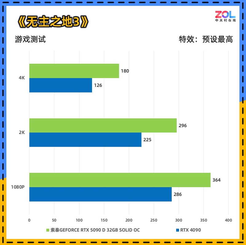 第四款游戏是《无主之地3》,它比较能概括RTX 5090 D与RTX 4090的光栅化性能的综合差距。经实测,索泰GEFORCE RTX 5090 D 32GB SOLID OC,1080p提升27%,2K提升32%,4K提升43%,综合提升34%。