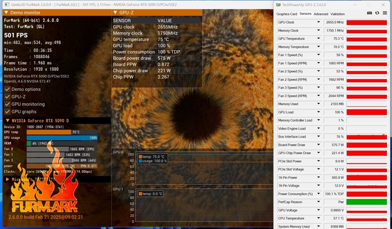 烤机测试,我们选择FurMark2搭配GPU-Z来进行,信息记录以GPU-Z为准。经过30分钟左右的烤机测试,索泰GEFORCE RTX 5090 D 32GB SOLID OC的GPU和显存温度为75.3℃和78℃,在TDP100%的满载情况下,整卡功耗575W,对于一款OC显卡来说,这个表现还是非常不错的。