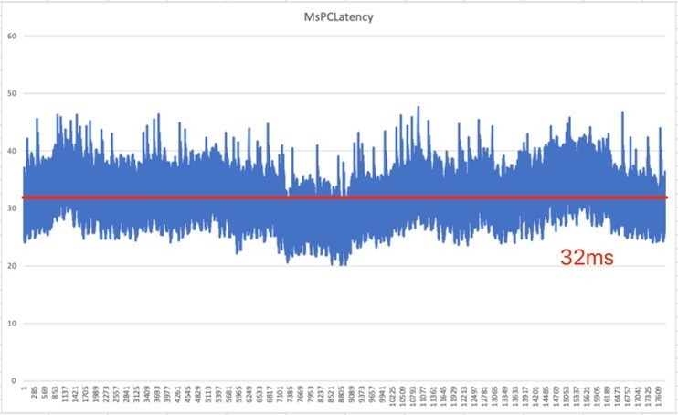 在功耗检测的同时,我们也调出了延迟数据,在DLSS4 4X多帧生成的环境下,游戏平均延迟仅为32ms,这意味着即便有多张AI生成帧参与到游戏中,延迟依然很低,效率进一步提升。