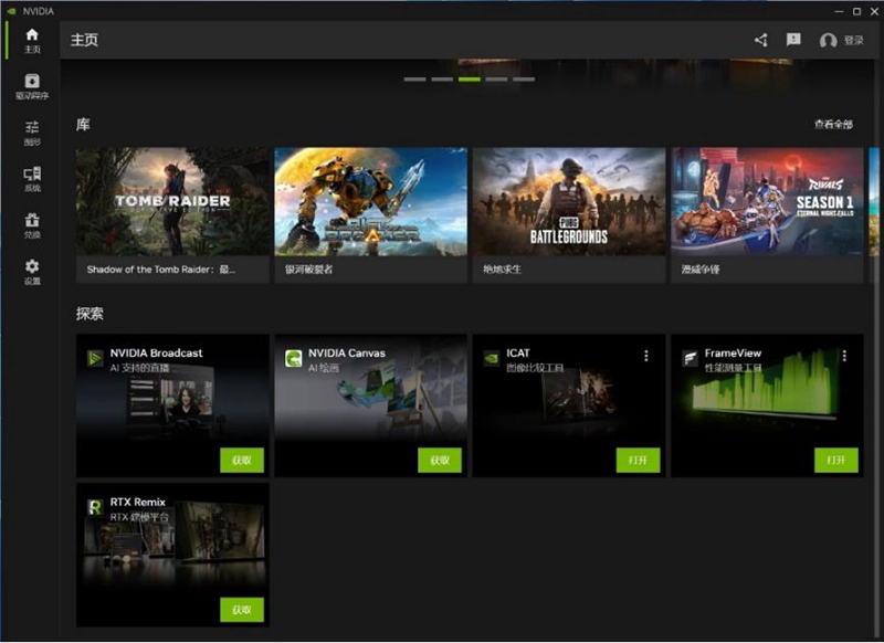新版的NVIDIA APP代替了原来的GFE软件,并且功能更强大,使用起来也更方便。最主要的是,它不用登陆了,即下即用。在APP首页除了显示最新的驱动信息,还新增了NVIDIA周边软件的下载,比如AI绘画Canvas;图像视频对比工具ICAT;性能测试工具FrameView等等,不用再去NVIDIA官网寻找。