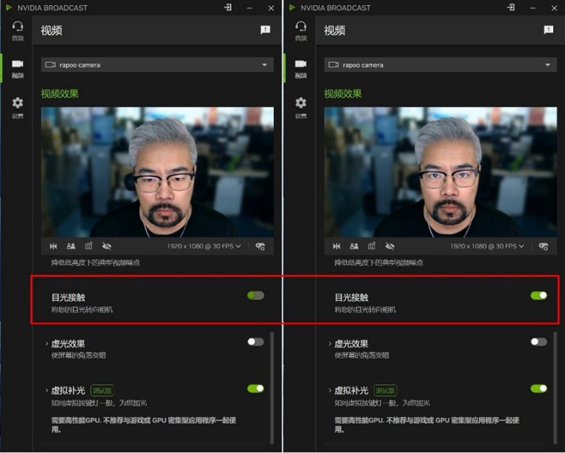 NVIDIABroadcast一些经典效果更方便开启,其中目光接触功能非常适合远程会议,即便眼睛盯着屏幕,也能让参与人员时刻注意到你的眼睛,并且还有一定“大眼”效果。