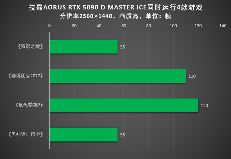 从实际体验来看,技嘉AORUS RTX 5090 D MASTER ICE这款显卡对性能的分配还是比较合理的,《CS2》在2K分辨率,高画质下稳定在120帧以上。《双影奇境》在2K分辨率,高画质下在55-65帧左右,双人分屏的体验还是不错的。《赛博朋克2077》拥有DLSS 4的加持,在2K分辨率下有110-130帧的优秀表现。《黑神话:悟空》的表现则稍差一些,2K分辨率高画质下的表现在55帧左右,偶尔会有丢帧的情况,整体不影响游戏的体验。