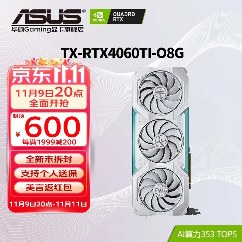 华硕 RTX4060Ti 8G/16G 巨齿鲨/天选TX/雪豹/电竞特工TUF AI算力 直播渲染制图电竞游戏台式电脑显卡 TX-RTX4060Ti-O8G天选 畅玩黑神话悟空/永劫无间/吃