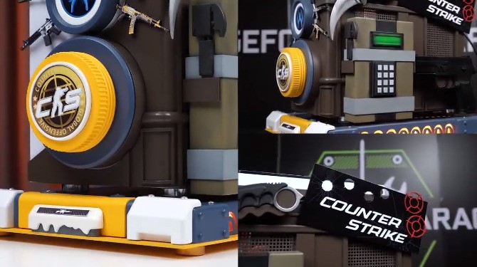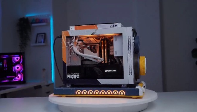 这款定制主机不仅性能卓越,还注重外观设计,紧跟小体积高性能趋势,满足玩家多样化需求。主机正面融入了《反恐精英》以及CT方logo,并且搭配上6款来自游戏中玩家最喜爱的主武器作为点缀。机身一侧为透明玻璃,贴有“弹孔”装饰贴纸,提升氛围感,另一侧则是游戏中的关键物品“C4”,可以说是细节、情怀拉满!