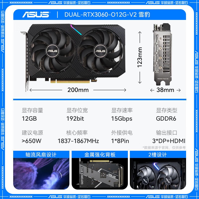 华硕 RTX3060 12显卡 雪豹/巨齿鲨/电竞特工TUF 台式机电脑游戏渲染设计绘图光线追踪独立显卡 DUAL 3060 O12G V2
