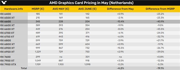 近两个月来,随着新一代显卡的陆续推出,主流显卡市场正在迎来新的洗牌,旧产品降价让位。据荷兰媒体Hardware.info统计,近两个月内在荷兰市场上NVIDIA、AMD显卡的价格普遍下降。其中,NVIDIA RTX 40/30全系显卡整体平均降价4.2%,对比平均建议零售价低了5.7%,RTX 3060和RX 6600最为明显,分别降价9.6%、10.4%,RX 6900 XT跌幅最大,达到了15.5%。而x70、x80系列则普遍略有上涨,无论是上一代还是这一代。总体而言,AMD的RX 7000/RX 600全系显卡的平均降价幅度也是4.2%,对比原价则平均低了19.1%之多,尤其是上一代中低端型号已经基本探底了。