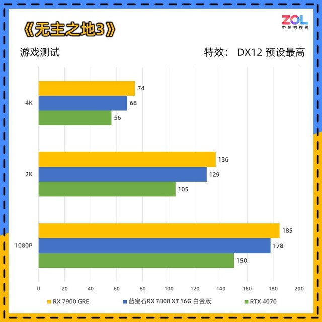 《无主之地3》中,测试DX 12环境,蓝宝石 RX7800XT 16G白金版相较RTX 4070分别提升为19%/23%/21%,综合提升21%左右。