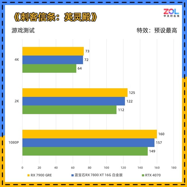 《刺客信条》系列历代都是显卡测试标杆,在《刺客信条:英灵殿》中,蓝宝石 RX7800XT 16G白金版相较RTX 4070的提升分别为5%/9%/13%,综合提升在9%左右。