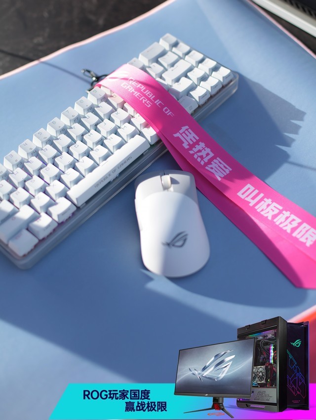在外围设备方面,主机配备了ROG月刃无线AP36K白色鼠标和ROG魔法指南竞技键盘,配合ROG太极地毯樱花粉限量版鼠标垫,为玩家打造完美的电子竞技感。耳机采用ROG棱镜白色限量版,为玩家带来最好的听觉盛宴。