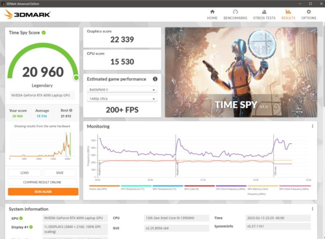 技嘉 RTX4090笔记本GPU以2.7%的优势成功击败了上一代旗舰桌面型号RTX3090Ti,这是通过3DMarkTimeSpy测试截图确认的,配备了NVIDIAAD103GPU,RTX4090笔记本GPU以2.7%的优势击败了上一代旗舰桌面型号RTX3090Ti,得分为22339个图形分数。它也比上一代旗舰RTX3080Ti笔记本GPU快72%。
