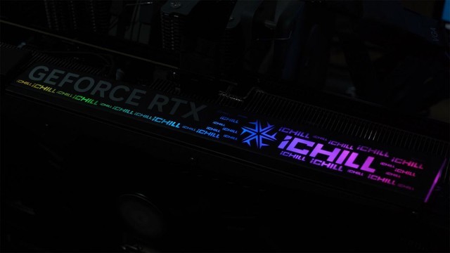 显卡侧面设计了一个巨大的IML模具印刷RGB灯箱顶部。这种技术广泛应用于许多豪华汽车的内部。当显卡没有点亮时,RGB灯箱相对低调内敛,有质感。但是一旦运行起来,就能感受到溢出的RGB效果。灯亮的时候五颜六色,灯熄的时候低调奢华,很抢眼。