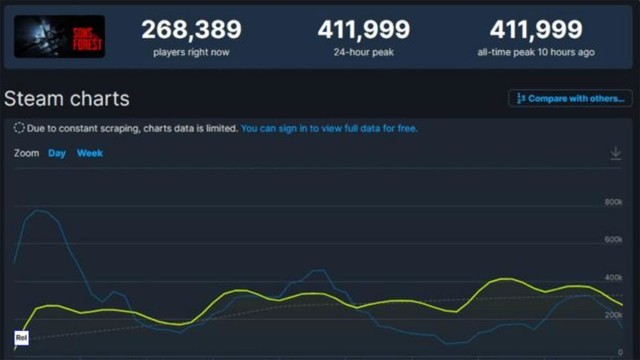 目前,Steam在《森林之子》中的最高在线人数已经超过41万,超过了长期占据榜单的游戏《Apex英雄》和《使命召唤19》,也击败了之前非常火爆的《霍格沃茨之遗》,也是直播平台Twitch中收视率最高的游戏之一。