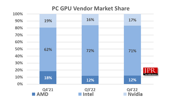 2022年第四季度,显卡总出货量同比下降38%,环比下降15.4%。