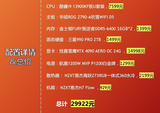 当然了,预算上到了三万元,当下性能最强的酷睿i9-13900F处理器和RTX4090显卡都给满上,当然32G DDR5内存、最强PCIe4.0消费级固态硬盘三星 990 PRO都不在话下。当然也可以配备质量更好的机箱、性能更好的散热器等,按照惯例先上配置单。