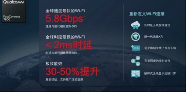 此外,FastConnect 7800Wi-Fi速度与前代相比提升60%,在320MHz信道或配对的160MHz信道,峰值速率可达5.8Gbps,6GHz频谱不可用地区,使用5GHz频谱的多条链路可达到4.3 Gbps峰值速度可达4.3Gbps;时延与前代相比降低50%,时延<2ms;续航提升30%~50%。