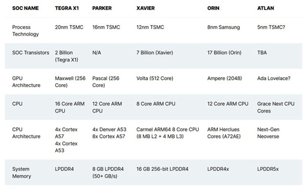 T234 SOC被认为具有2048安培GPU CUDA核心和12x ARM Cortex-A78AE(Hercules)64位核心。将在此基础上定制设计的T239被建议提供略微不同的规格。该SOC将使用的具体GPU似乎是 Ampere GA10F,据传该芯片据说(或传言)具有与ORIN相同的 SEC8N 速率,1024 FP32速率,或ORIN的一半。该SOC也将可能支持 AV1。