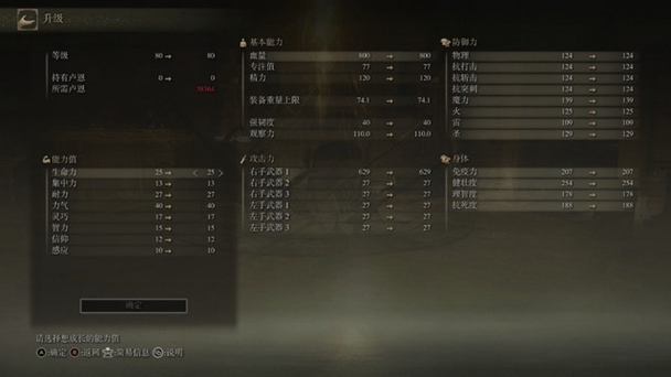 力气、智力、灵巧、信仰、感应就是攻击力方面的加点,可以根据自己想走的职业,或是想拿的武器进行加点,比如想走力量号,而且武器对于力气的加成是B以上的等级,那么本身力气达到武器的需求外,继续加力气属性则可以或者更高的攻击力,法师同理,只要不断的加智力即可或者高额的输出,当然也不能落下武器的等级强化。