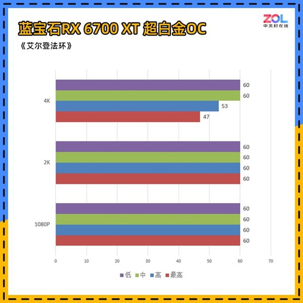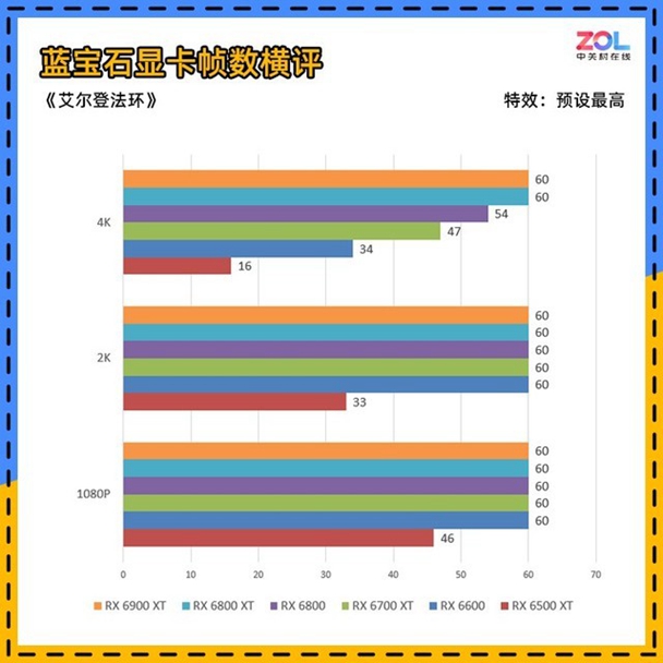 帧数测试上,虽然我们从RX6500XT准备到RX6900XT的显卡,但由于目前游戏硬锁60帧,在RX6800型号后,4K分辨率下也全部为60帧,故不一一列出。