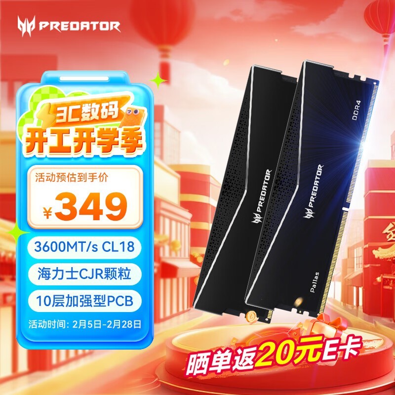 宏碁 32G DDR4 3600频率 台式机内存条 Pallas系列(C18)黑色 海力士 CJR
